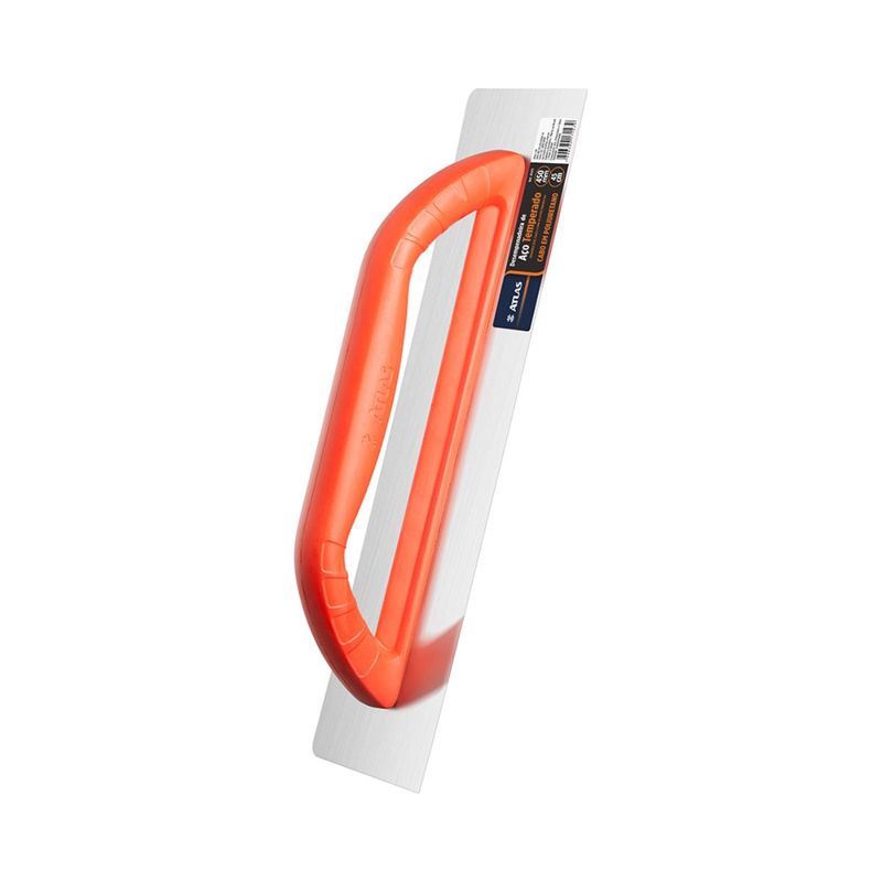 DESEMPENADEIRA DE AÇO TEMPERADO COM um canto reto e outro arredondado de 12X45CM. CABO FECHADO DE POLIURETANO. IDEAL PARA APLICAÇÃO DE MASSA, TRABALHOS EM GESSO. OTIMA RELAÇÃO DE LEVEZA E RESISTÊNCIA.
