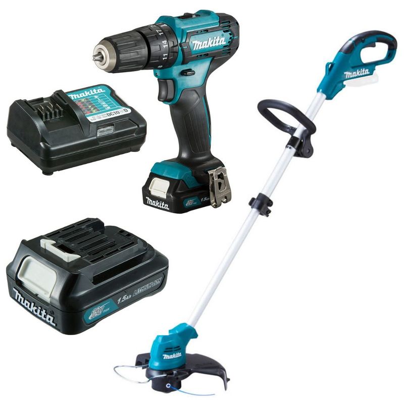 Parafusadeira/Furadeira - Projetada com a tecnologia CXT, 20 níveis de torque, Seletor de funções, 2 velocidades mecânicas, Velocidade variável, Freio instantâneo. Rotação reversível, Mandril de aperto rápido, Iluminação de trabalho. Aparador de Grama - Tipo de punho D, Diâmetro de corte, Carretel de nylon, 260 mm (nylon Ø 1,65 mm) Lâmina plástica, 230 mm Rosca do eixo, M8 x 1,25RH Rotações, Alta - 10.000 rpm peso, 1,7kg¹ / 2,1 kg² sem bateria 2 com bateria 12Vmáx (4,0Ah) BL1041B